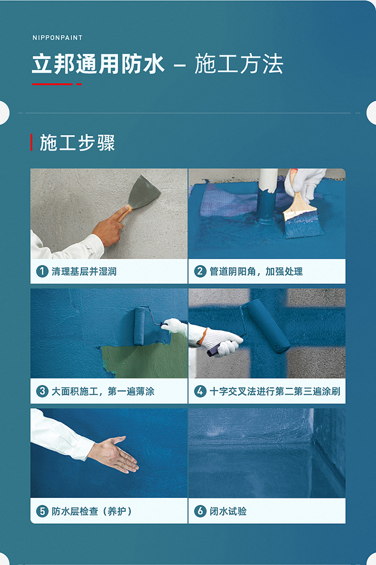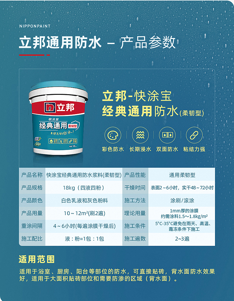 立邦防水涂料快涂寶經典通用防水材料:彩色防水,品質更加,彩色涂膜,有效避免漏涂;可在無明水的潮濕基面直接施工。