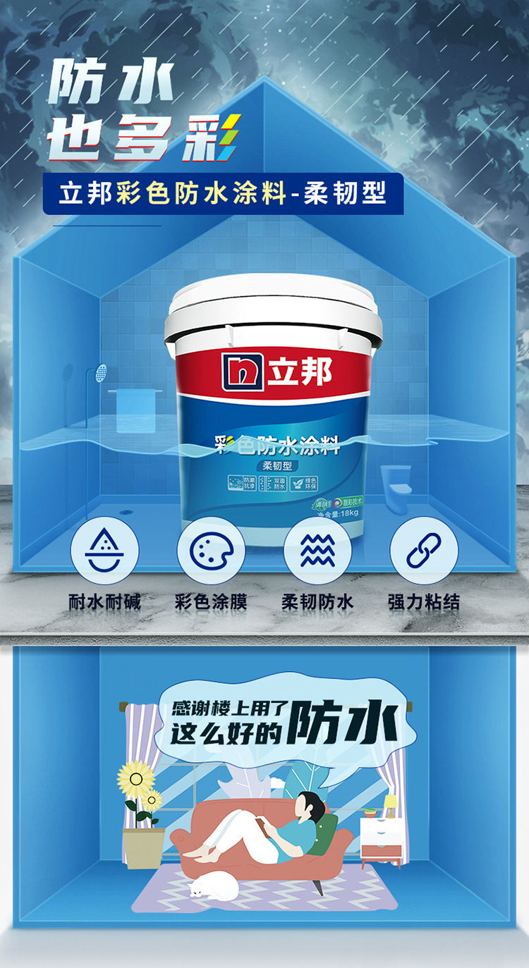 立邦彩色柔韌型防水涂料:彩色防水,耐水耐堿。