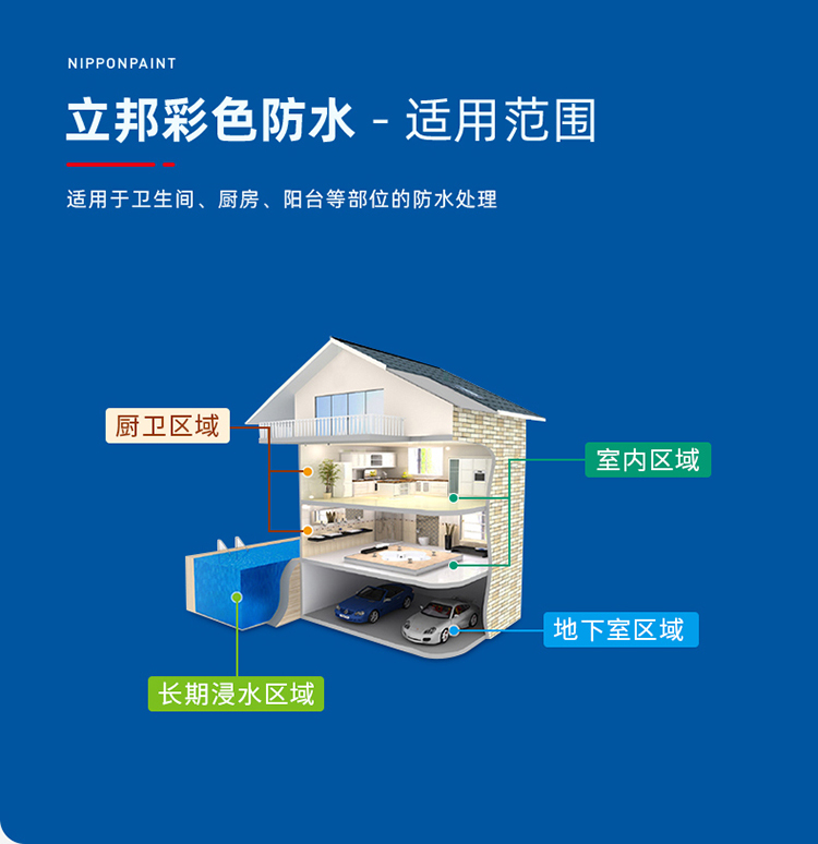 立邦彩色柔韌型防水涂料:快速干燥,省時貼心,干燥速度快,工期短。