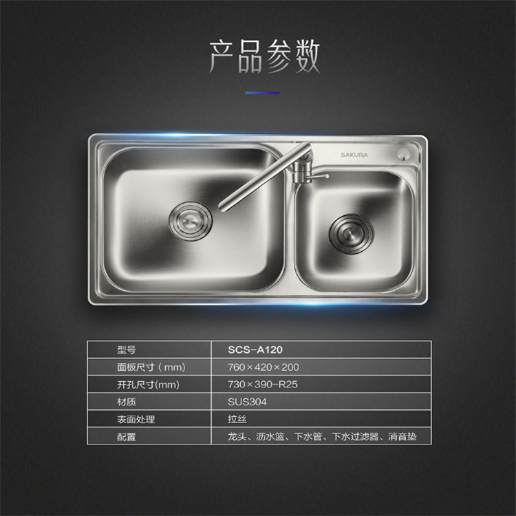 櫻花SCS-A120水槽廚房S304不銹鋼水槽洗菜盆單槽帶支撐架子大小洗碗臺盆手盆池產品參數