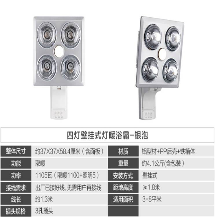 - 型號名稱【壁掛4丁-銀泡】4燈分控壁掛浴霸
