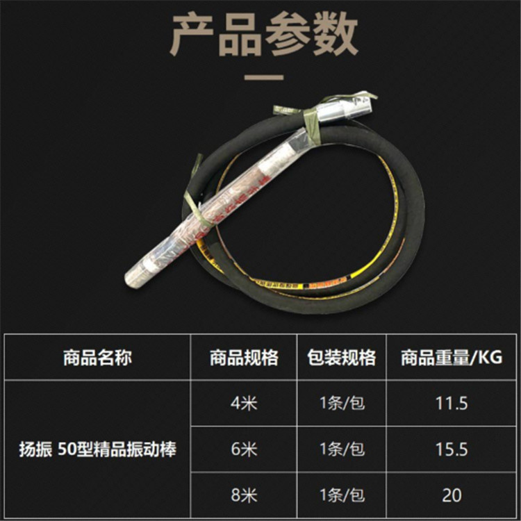 楊振50型精品振動棒可作為驅動裝置采用軟管傳動方式,方便施工,遠離動力(包括電機),不帶電,安全保險,沒有空載燒機的弊病,性能可靠穩(wěn)定。
