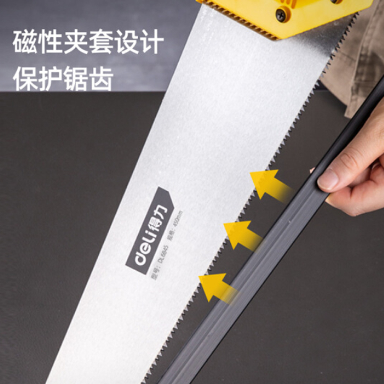 得力(deli) 手板鋸木工鋸子產品特點 65Mn鋼鋸片 兩面磨齒 防滑手柄 磁性夾套設計