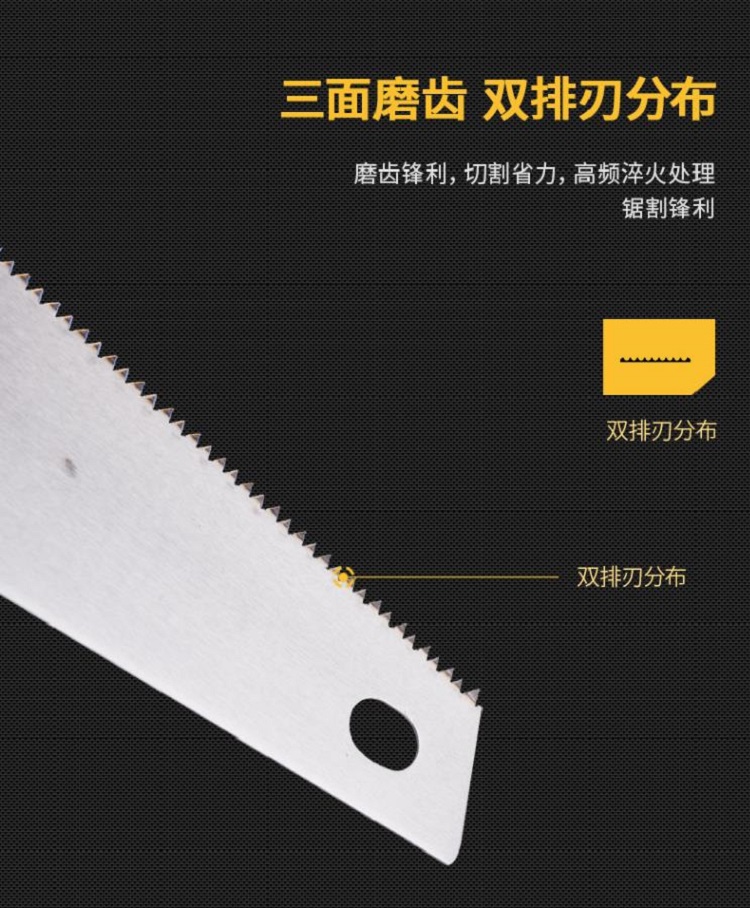 得力工具手板鋸兩面磨齒、雙排刃分齒,表面高頻淬火處理,鋸割鋒利。