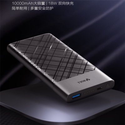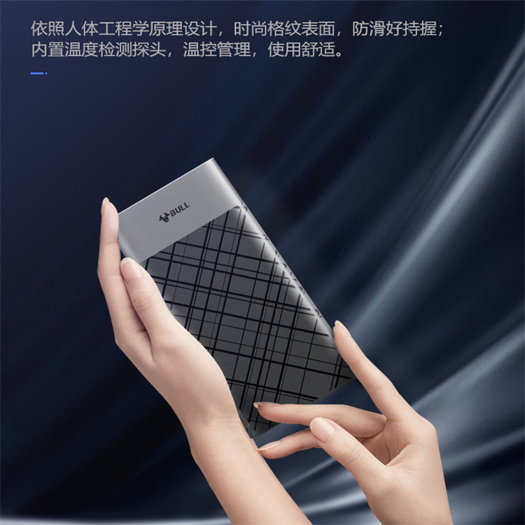 公牛移動電源(快充版)依照人體工程學原理設計,時尚格紋表面,防滑好握持,內