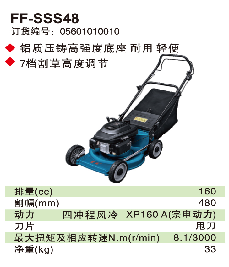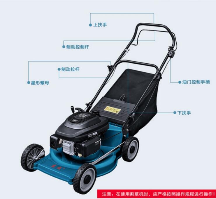 提示:FF-SSS48汽油草坪機在使用前,必須先清除草坪上石子、鐵絲、樹枝等雜物;潮濕的草蘋要等曬干后才能割草;轉灣時兩手向下按,使前輪離地后再轉灣(但不要太高)。