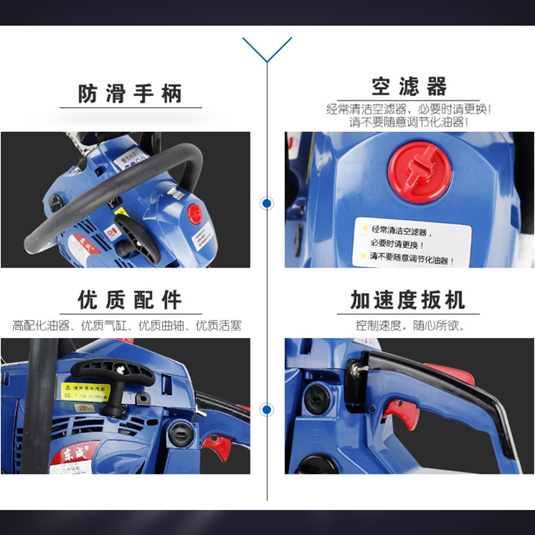 汽油鏈鋸產品四大特點:防滑手柄、空濾器、優質配件、加速度扳機