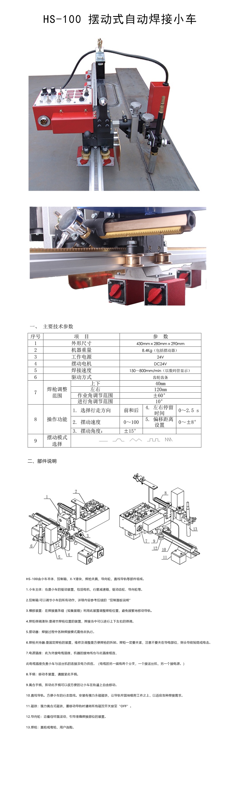 HS-100擺動(dòng)式焊接小車是自動(dòng)裝置,一次焊接可以獲得較寬的焊縫。擺動(dòng)速度、擺動(dòng)角度、中心偏移位置、和左右停留時(shí)間均可調(diào)整,適合各種不同規(guī)格的焊道。非焊接狀態(tài)下的小車行走速度為值(800mm./min)。注意:由于焊接小車向氣保焊機(jī)是常通信號(hào),且焊接不可避免地留有殘端,故設(shè)置和焊接時(shí)焊機(jī)的自保回路開(kāi)關(guān)必須關(guān)閉……OFF。如果設(shè)置成開(kāi)(ON),則焊接小車停止行走,電弧卻不會(huì)熄滅。